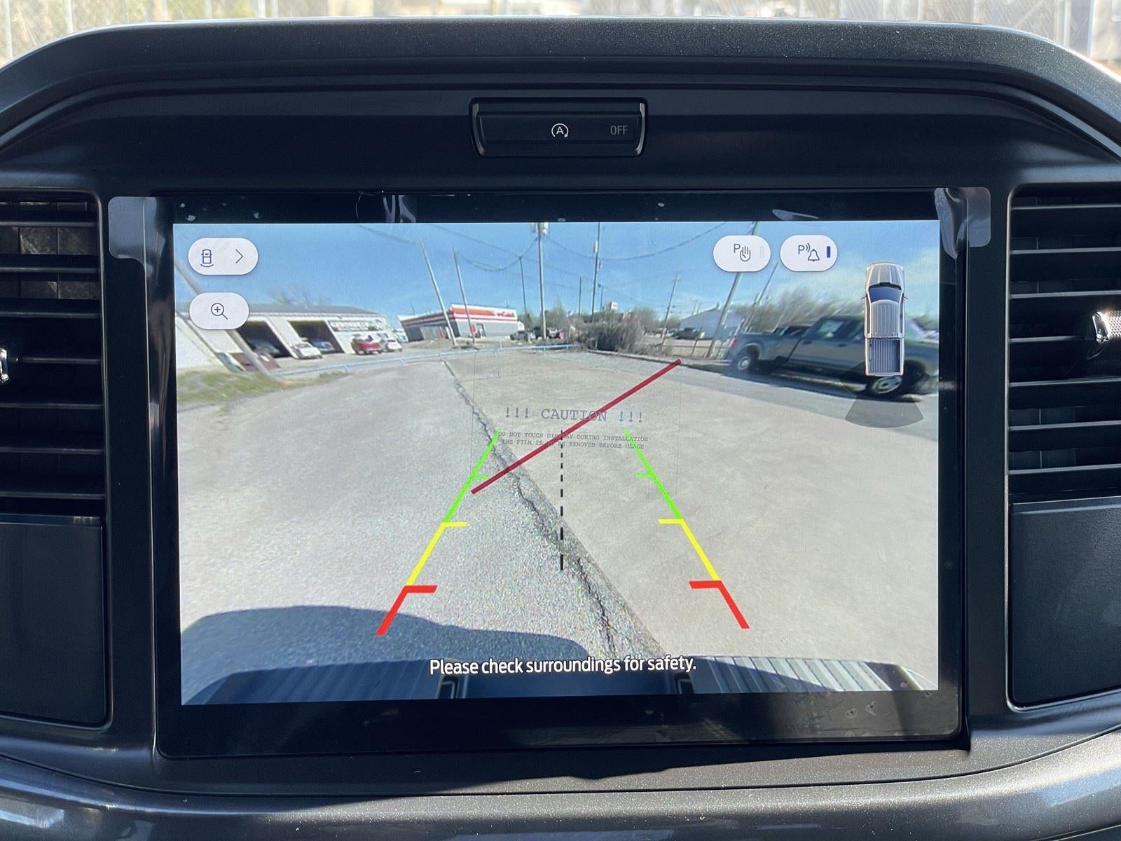- The vehicle is equipped with a camera that displays an image of the area behind the vehicle on an interior display.