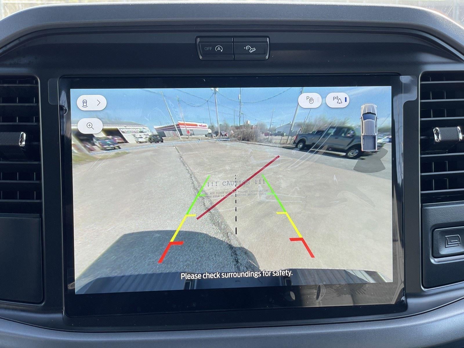 - The vehicle is equipped with a camera that displays an image of the area behind the vehicle on an interior display.