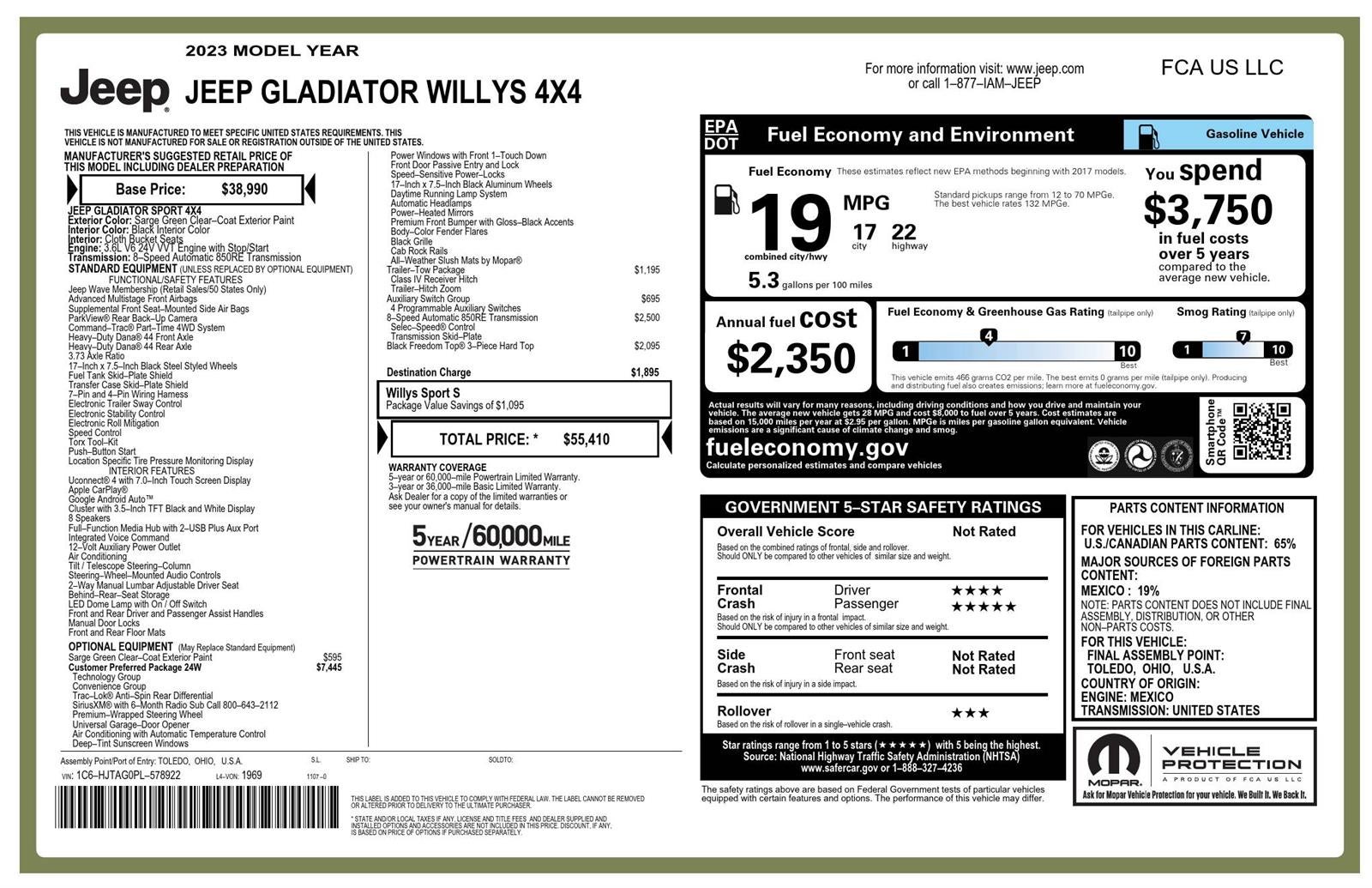 Clean Carfax! One Owner!**WARRANTY REMAINING: 12 MONTHS OR 5,982 MILES****CUSTOMER PREFERRED PACKAGE 24W** ($7,445 ADD TO MSRP), **8-SPEED AUTOMATIC 850RE TRANSMISSION** ($2,500 ADD TO MSRP), **BLACK FREEDOM TOP 3-PIECE HARD TOP** ($2,095 ADD TO MSRP), **TRAILER-TOW PACKAGE** ($1,195 ADD TO MSRP), AUXILIARY SWITCH GROUP, SARGE GREEN CLEAR-COAT EXTERIOR PAINT, 3.6L V6, 8-SPEED AUTOMATIC 850RE TRANSMISSION, 4WD, KEYLESS ENTRY, PUSH BUTTON START, REMOTE START, 7'' IN SCREEN DISPLAY, UCONNECT 4, APPLE CARPLAY, ANDROID AUTO, Bluetooth® FOR HANDS-FREE PHONE, REAR VIEW CAMERA, UNIVERSAL GARAGE-DOOR OPENER, 7-PIN AND 4-PIN WIRING HARNESS, ELECTRONIC TRAILER SWAY CONTROL, ELECTRONIC STABILITY CONTROL, ELECTRONIC ROLL MITIGATION, CLASS IV RECEIVER HITCH, TRAILER-HITCH ZOOM